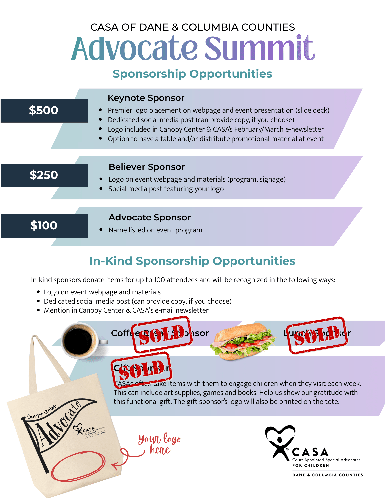 You can support those who work directly with foster children - CASA Volunteers who meet with children weekly and advocate for their best-interests; foster parents who care and support children, around the clock; and others working with vulnerable youth populations. Sponsorships help keep this event free for CASA Volunteers, bring in expert speakers and create connection for people making a difference in the lives of children and youth, every day.