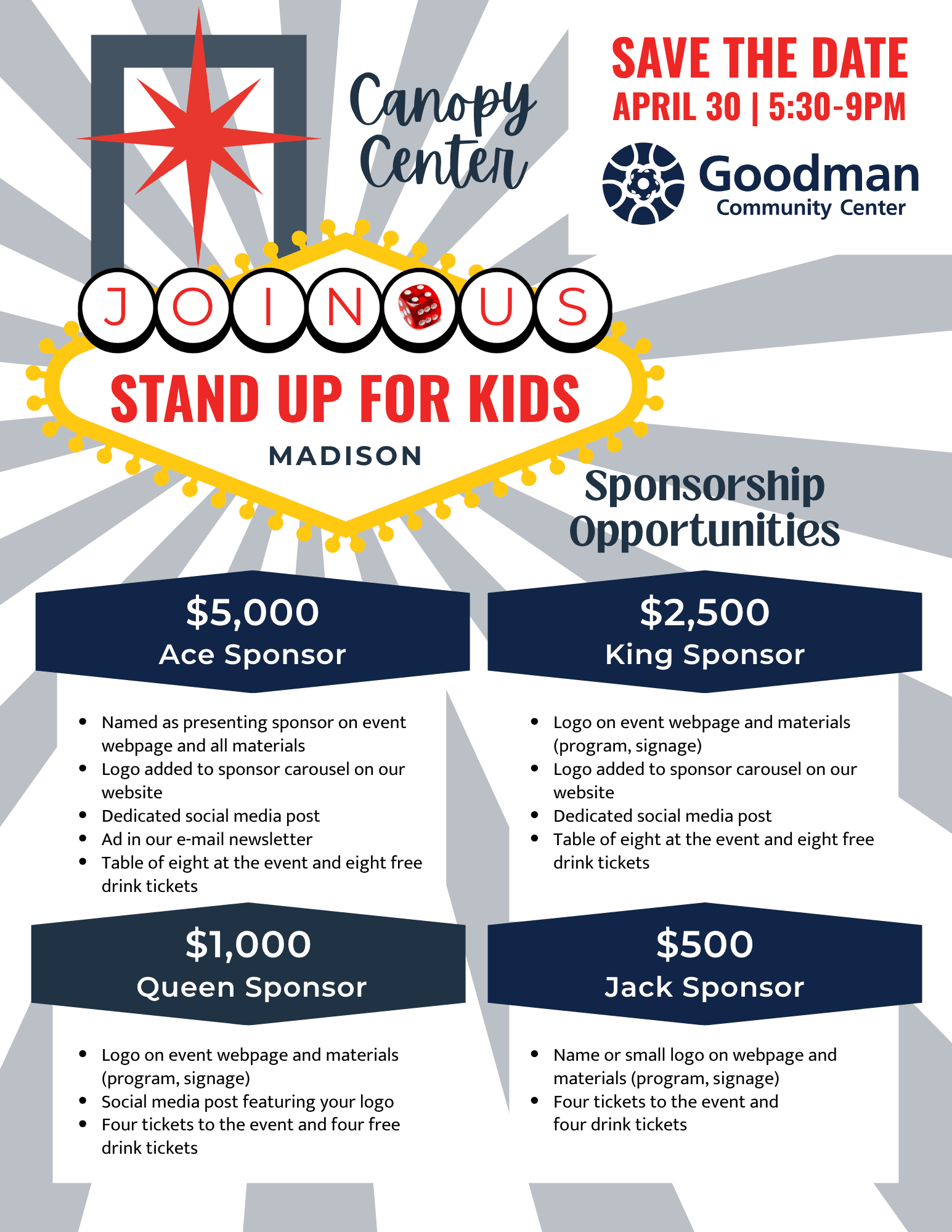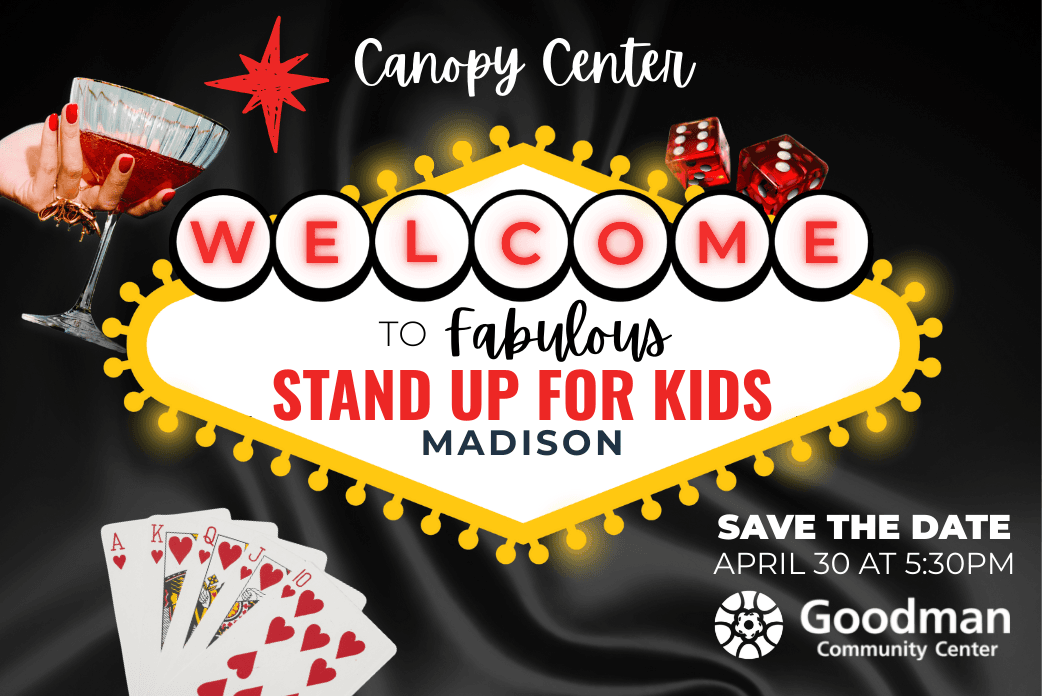 Celebrate with us at Canopy Center's annual Stand Up for Kids fundraiser! This year, we're bringing Las Vegas energy right here to Madison. Think bright lights, bold glam and a night full of fun surprises. Enjoy great food, a lively cash bar, and try your luck all for a good cause: safety, advocacy and healing for children and families impacted by trauma.